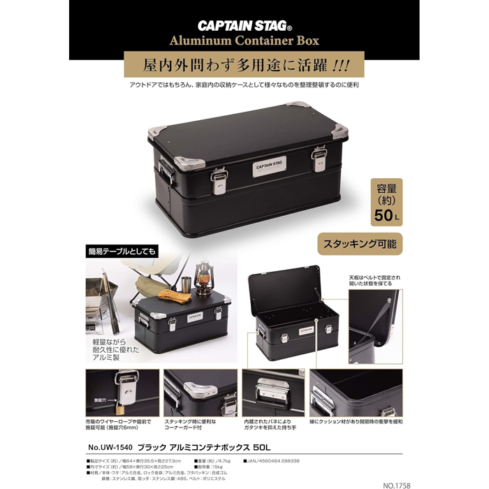CAPTAINSTAG(キャプテンスタッグ)アウトドア コンテナ 施錠可能 ブラック アルミコンテナボックス 容量50L 取っ手付き スタッキング可能UW-1540【頑張って送料無料!】