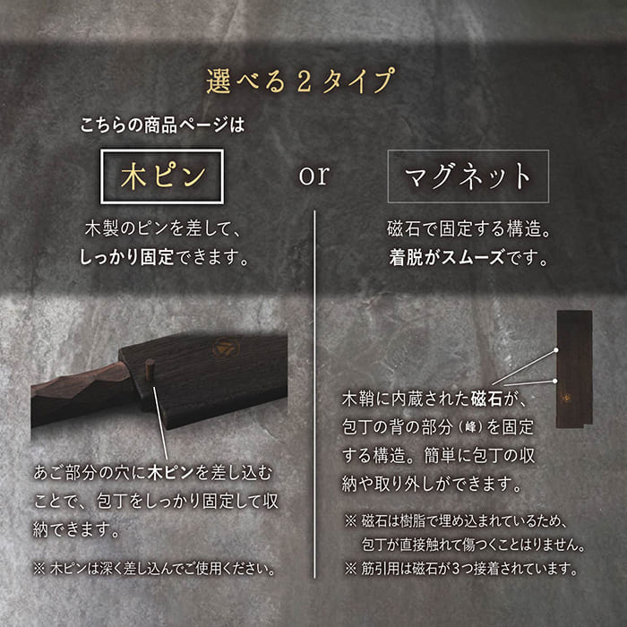 あご部分の穴に木ピンを差し込むことで、包丁をしっかり固定して収納できます。