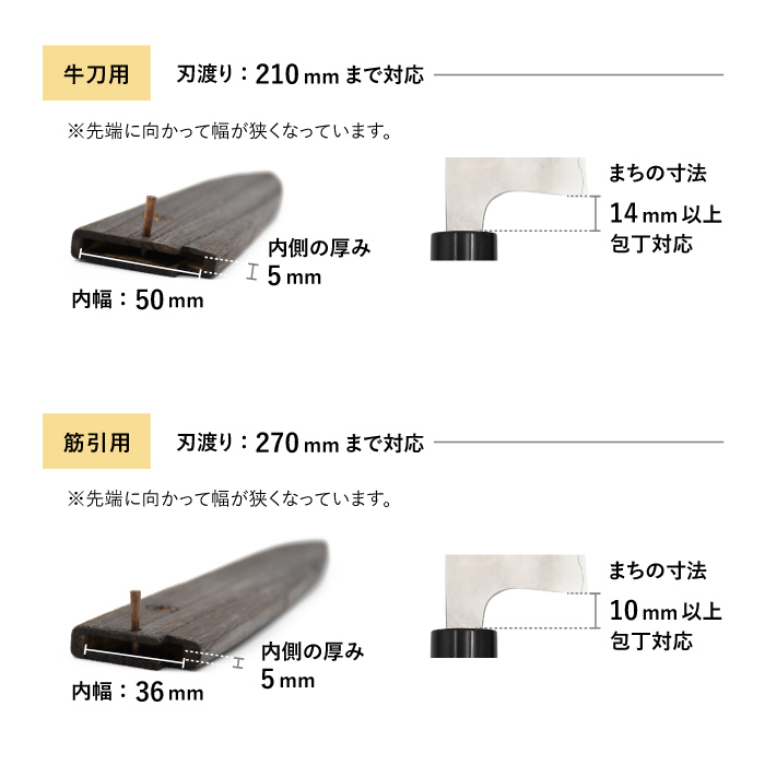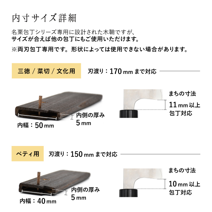 名栗包丁シリーズ専用に設計された木鞘ですが、サイズが合えば他の両刃包丁にもご使用いただけます。