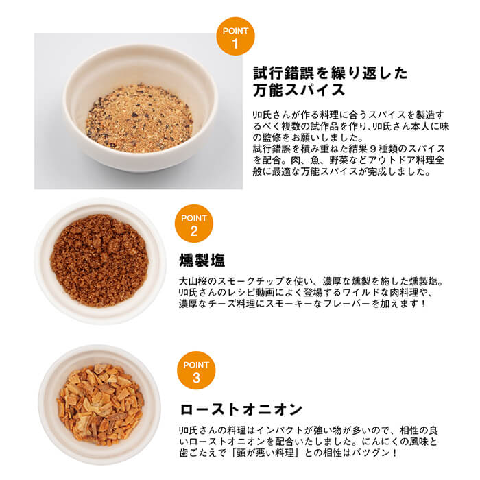 試行錯誤を積み重ねた結果9種類のスパイスを配合。肉、魚、野菜などアウトドア料理全般に最適な万能スパイスが完成しました。