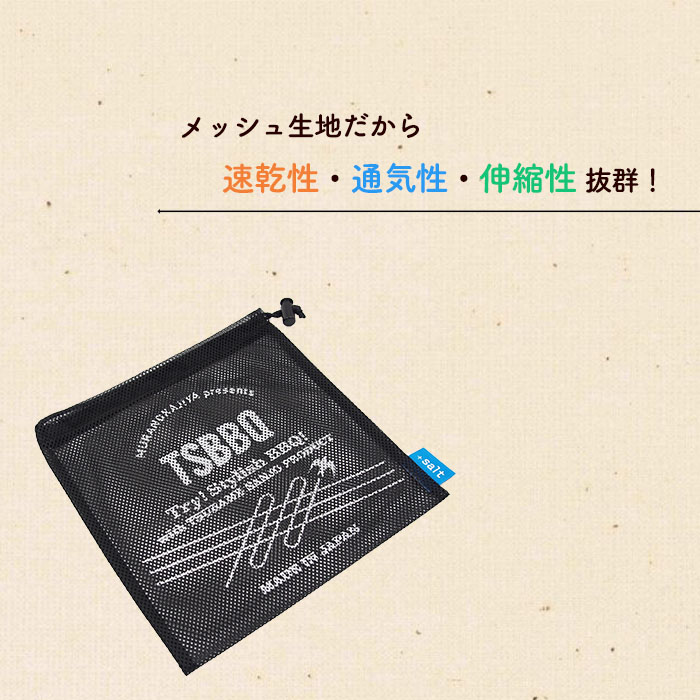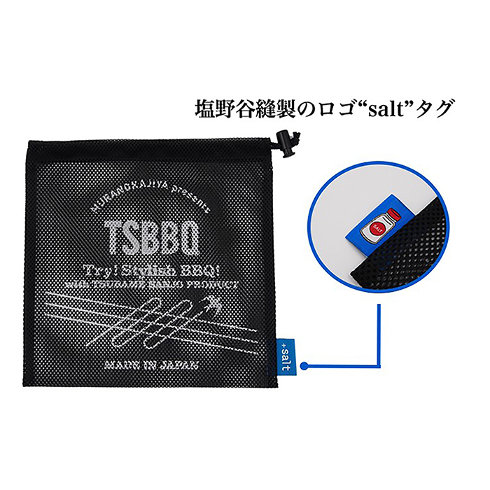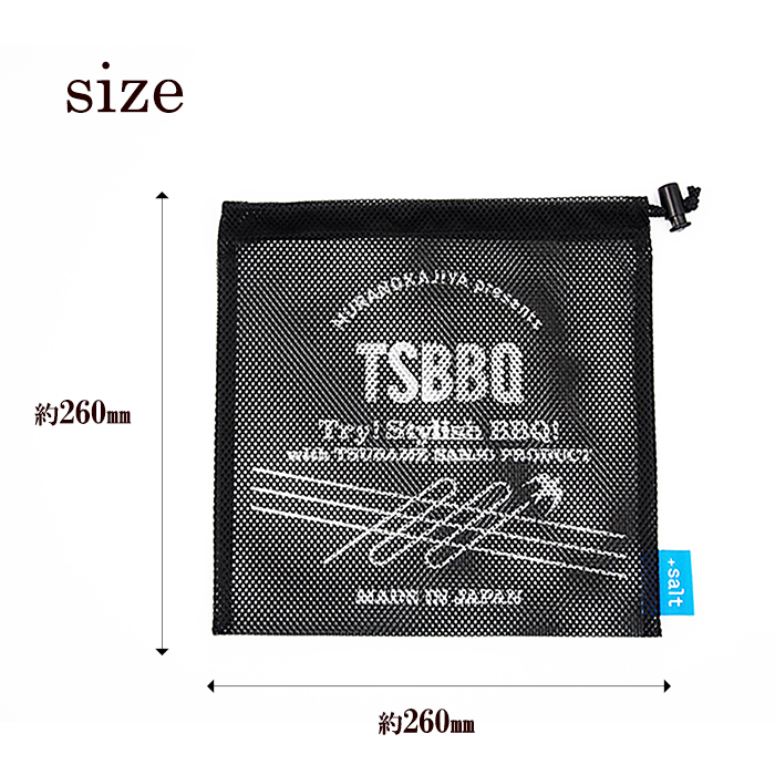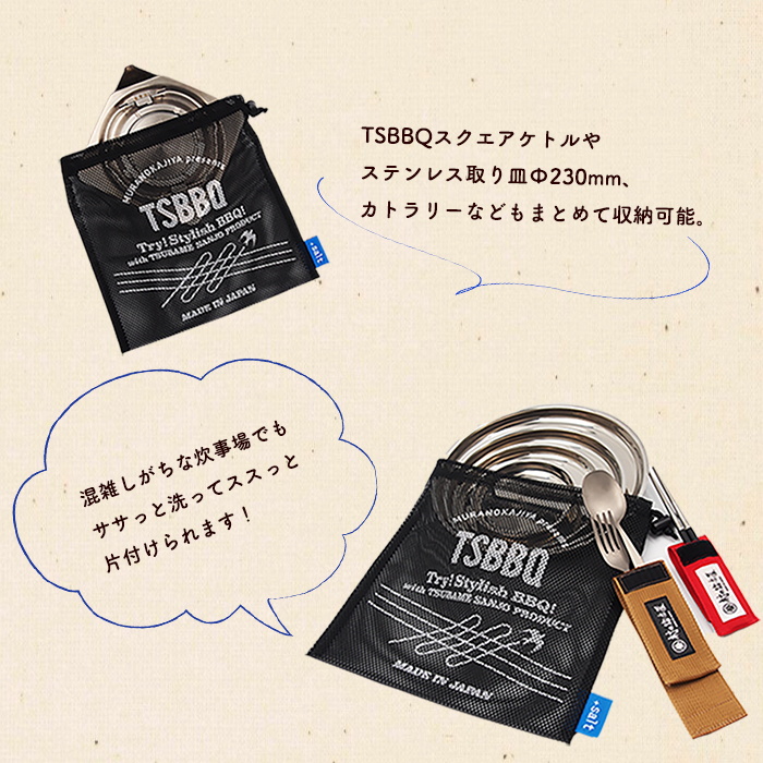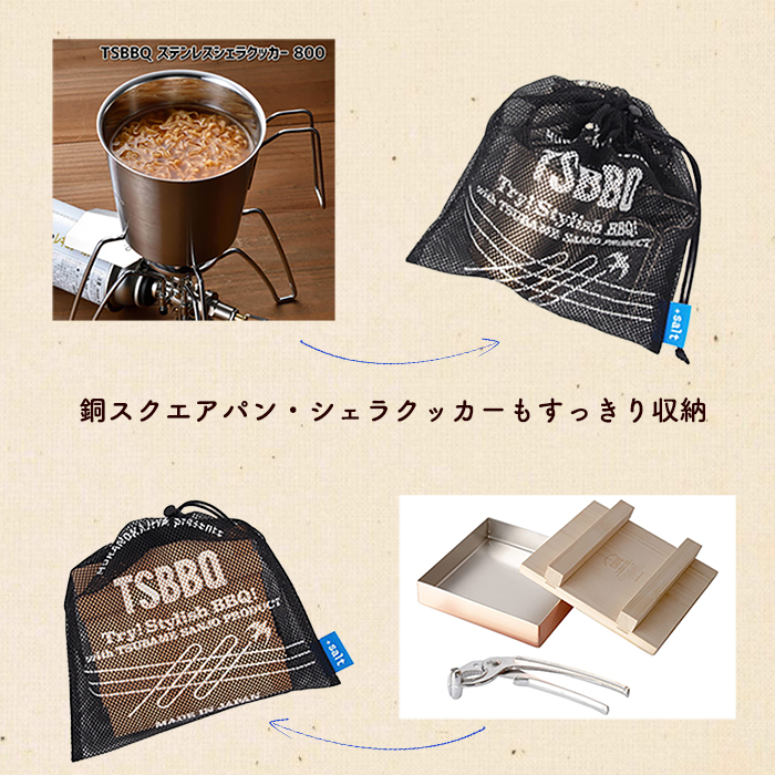 そんな塩野谷縫製とコラボしたTSBBQ+saltメッシュ巾着は、シェラクッカーや銅スクエアパンの収納に最適なサイズ!