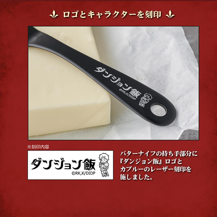 バターナイフの持ち手部分に『ダンジョン飯』ロゴと、カブルーのレーザー刻印を施しました。