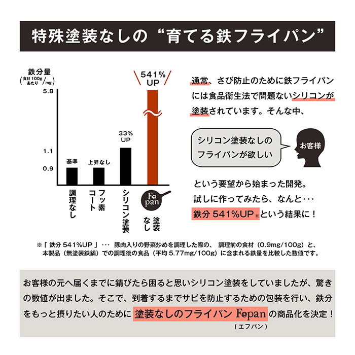 そこでもっと鉄分を摂りたい人のために、内側は塗装なしのフライパン「Fepan(エフパン)」を商品化しました!
