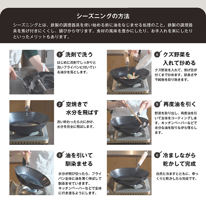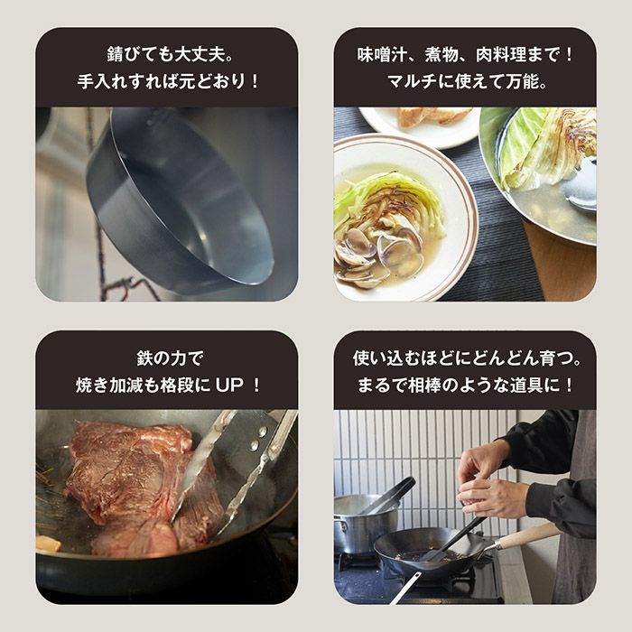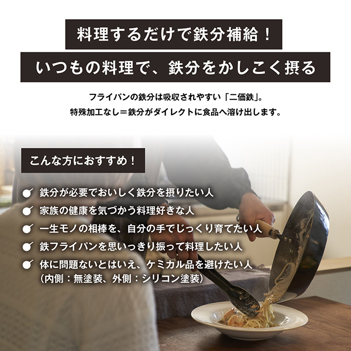 鉄フライパンは、使用していくうちに錆びたとしても落とせます!育てて一生使える、本物志向の一本。