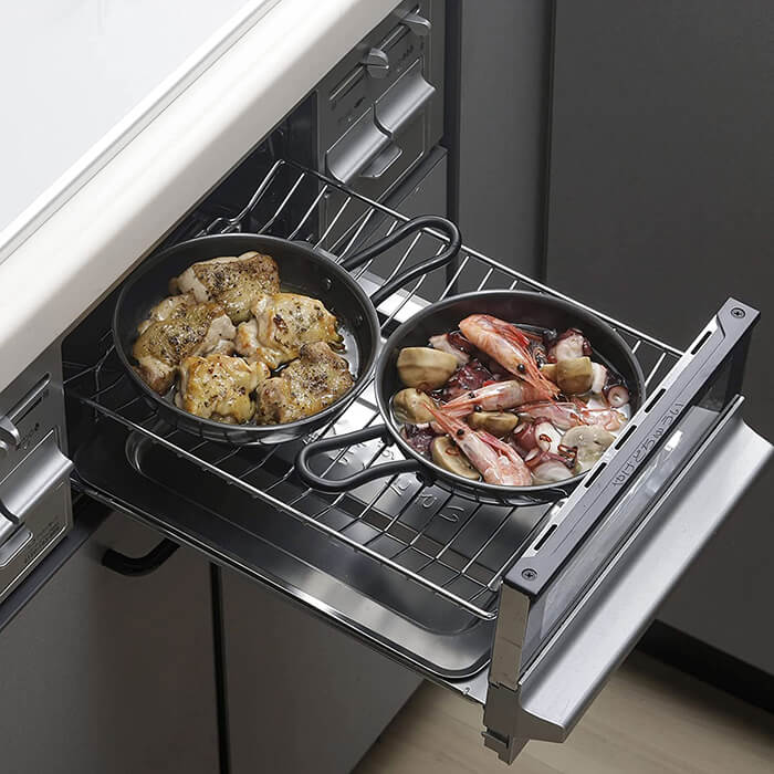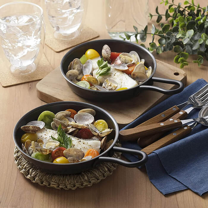 調理してそのまま食卓に!ガス火、IH調理器はもちろん、オーブンや魚焼きグリルでも調理できる魚焼きグリルに2個入るサイズ。