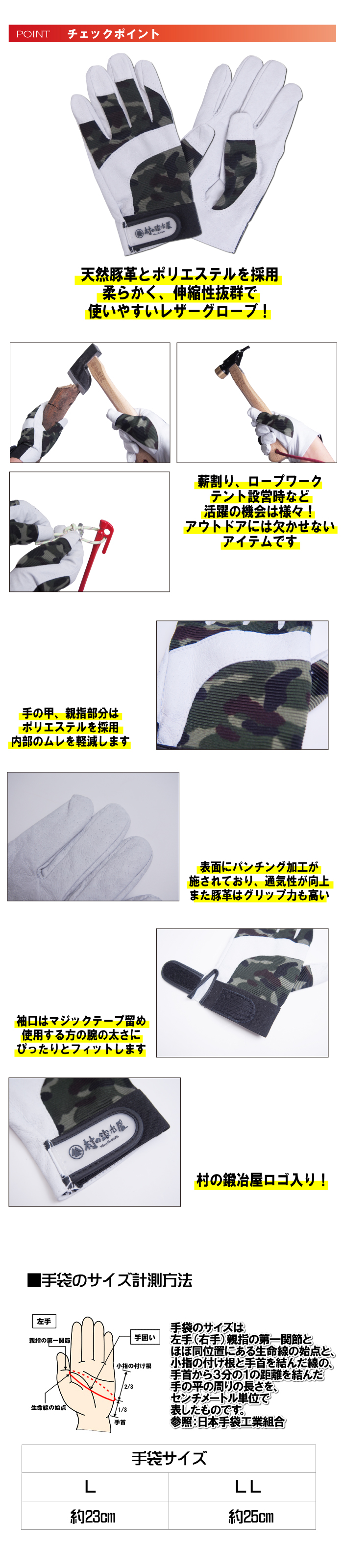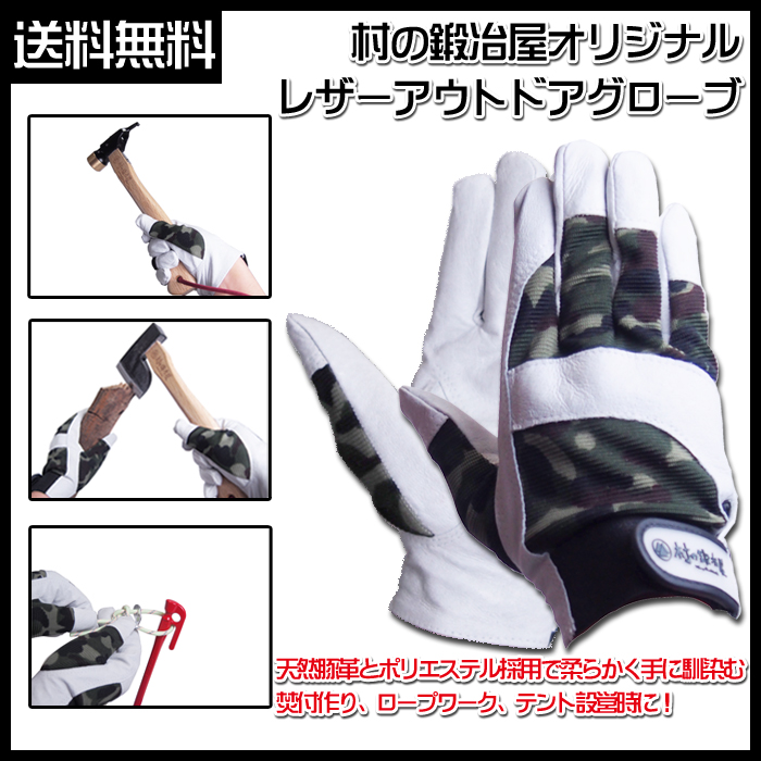 【頑張って送料無料!】 村の鍛冶屋オリジナル レザーアウトドアグローブ 天然豚革・ポリエステル使用で伸縮性が高く通気性もいい カモフラカーキ 迷彩 グリーン 白 アウトドアに欠かせない革手袋 ネコポス発送のため代引き日時指定不可