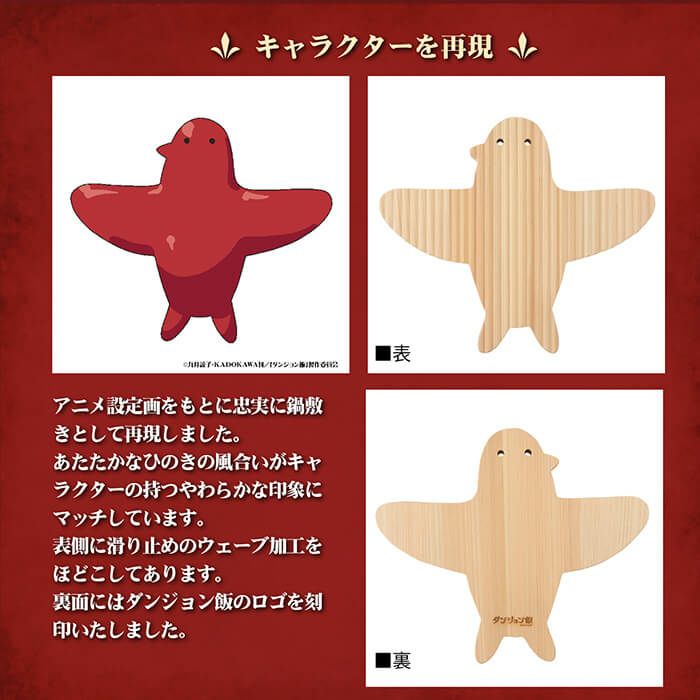 他の画像を見る アニメ『ダンジョン飯』とのコラボアイテム第二弾! 【DGM-021】ダンジョン飯 ひのきのカッティングボード(ミスルン)『ダンジョン飯』キャラクターとロゴを刻印土佐の四万十ひのきを使用した逸品 税込価格 ¥ 5,280 税込 カートに入れる お気に入りに登録する