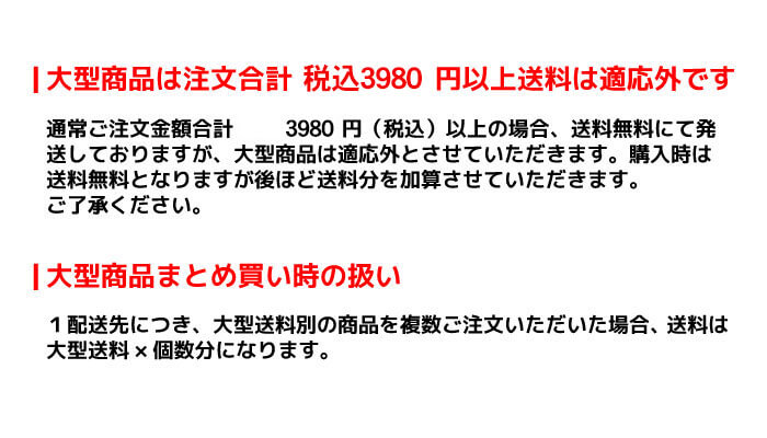 通常ご注文金額合計3980円(税込)以上の場合、送料無料にて発送しておりますが、大型商品は適応外とさせていただきます。