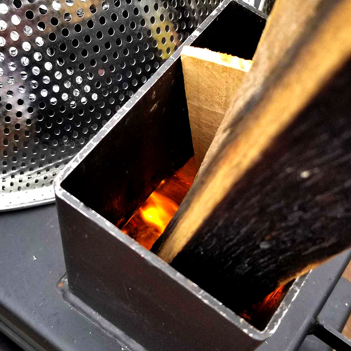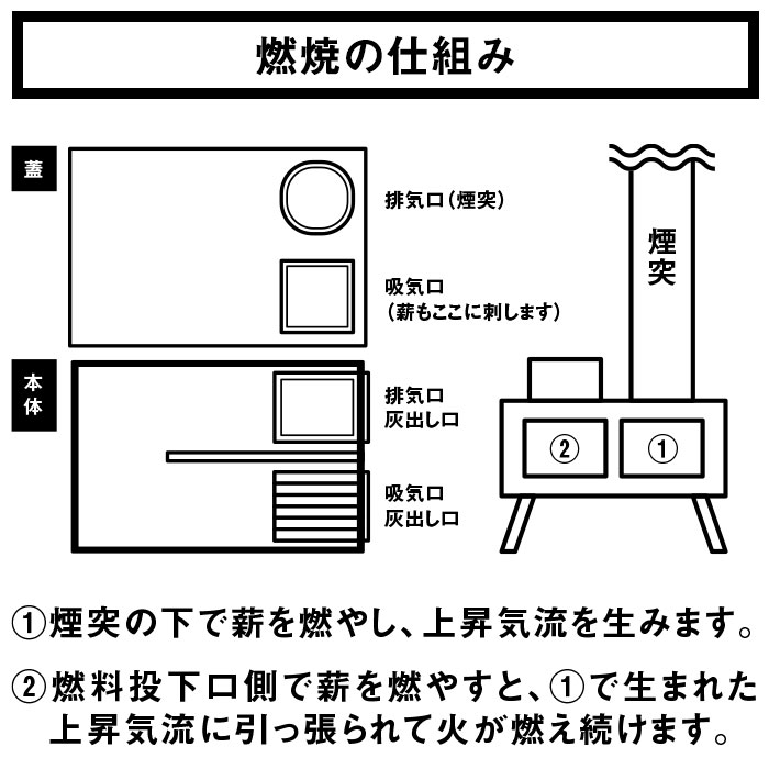 一度火が付けば、強力な上昇気流により、吸気口から排気口に向けて火が燃え続けるので、薪が尽きない限りは暖かさが耐えません!