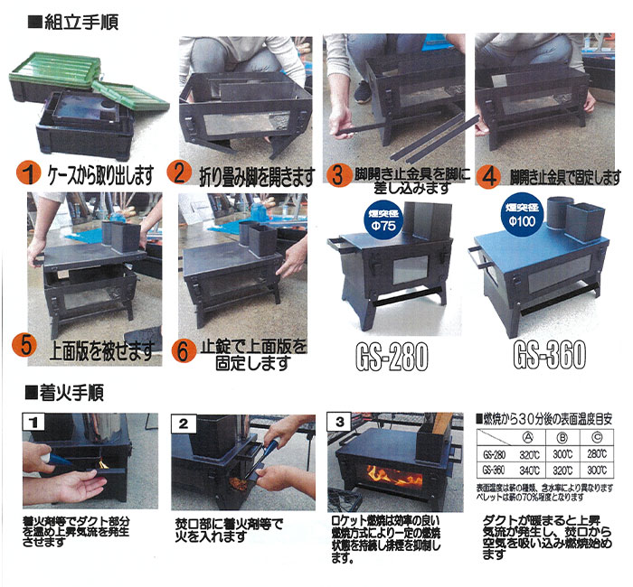 GS-280用煙突(直筒Φ75×500mm3本/ニップル2トップ/煙突ガード)