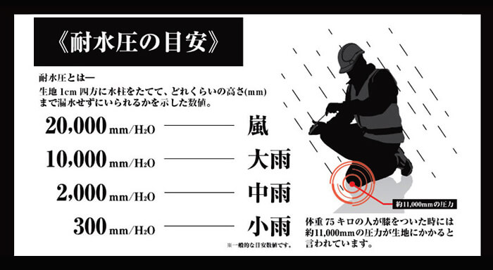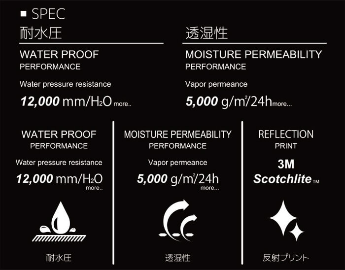 └ 耐水圧 12,000 mm/H2O (JIS L 1092 B法)