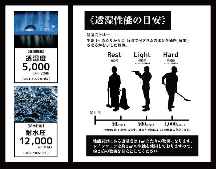 └ 透湿度 5,000 g/m2/24h (JIS L 1099 B-1法)