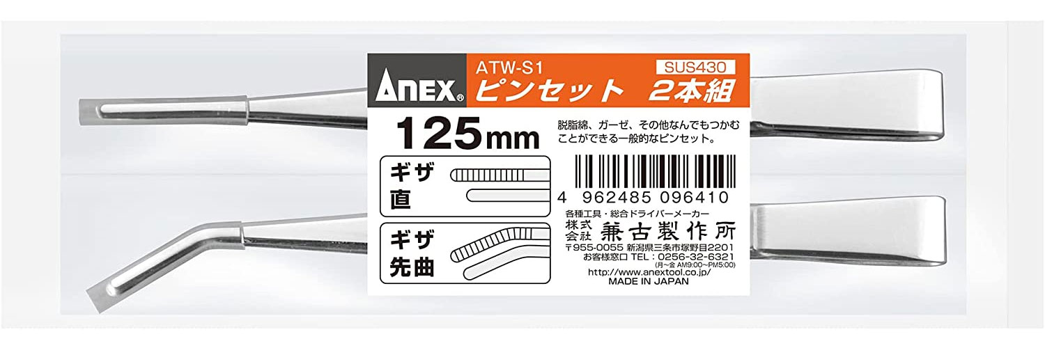 ANEX ステンレスピンセット 先端ギザ 125mm×2本組(直/先曲)[ATW-S1]