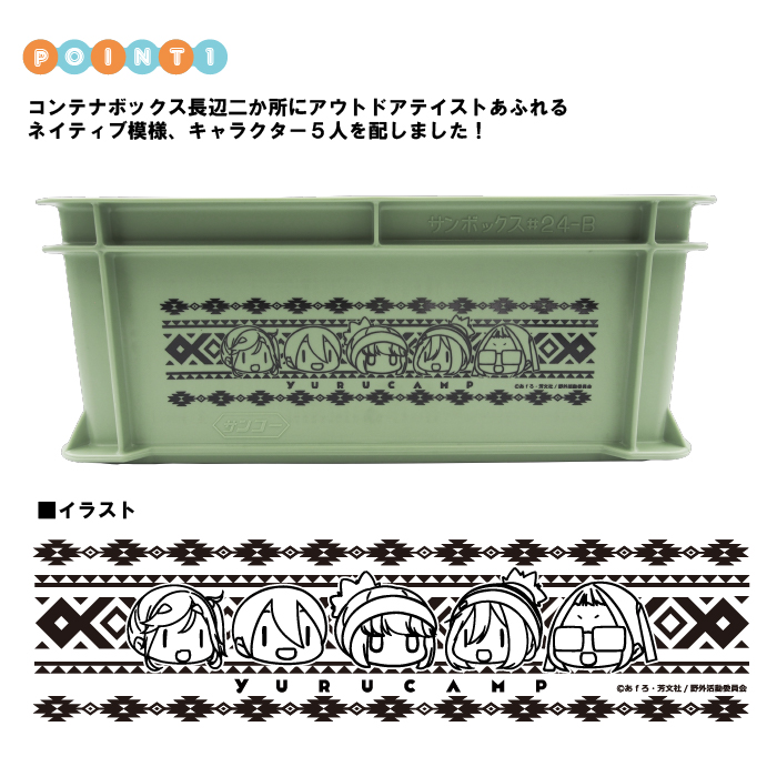 コンテナボックス長辺二か所にアウトドアテイストあふれるネイティブ模様、キャラクター5人を配しました!