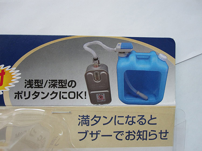 満タンになるとブザーで知らせてくれる。浅型/深型のポリタンクに対応しているので幅広く使える。