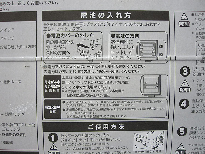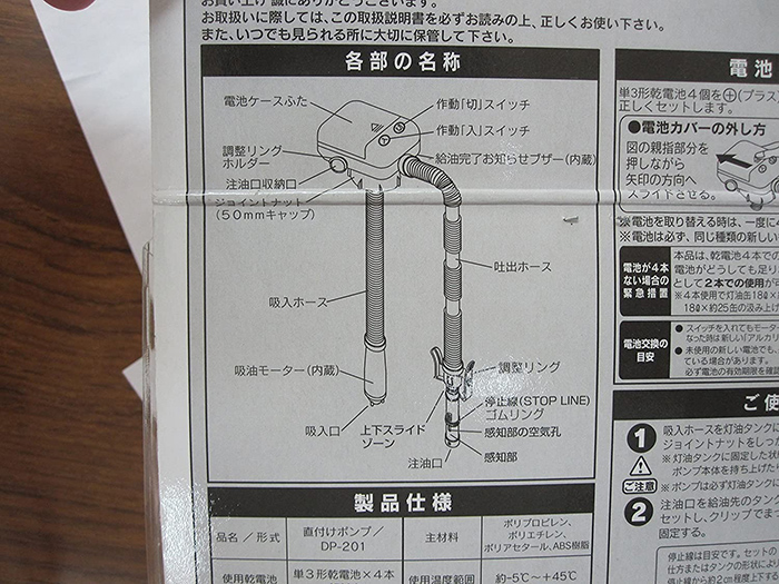 仕様:動作入/切スイッチ、満タン警告ブザー、注油口収納口
