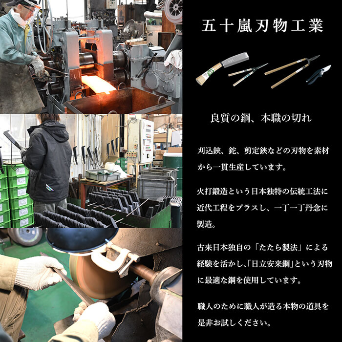 名匠「鋼典」は、刈込鋏、鉈を主要品目に本職用最高級刃物として一丁一丁丹念に熟練職人が創り上げたブランドです。機能性を追及し、純度の高い鋼を火打ち鍛造で鍛えた鋭い切れ味が特徴です。
