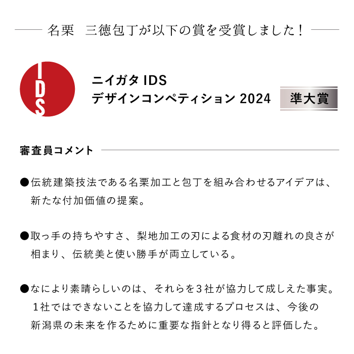 伝統を受け継ぎ続ける包丁の産地・三条市に会社を構える3社が協力し、名栗包丁を手掛けました。