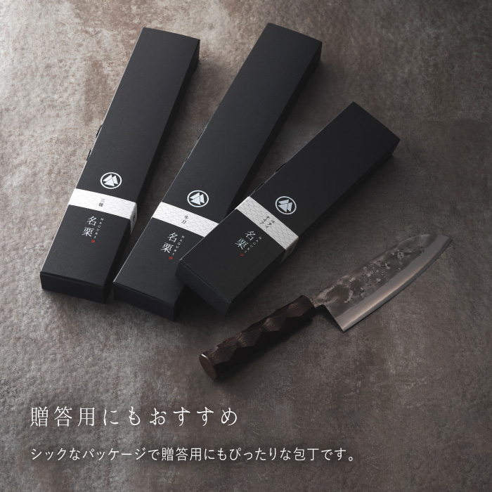 マットな質感の外箱に巻かれた帯には名栗の凹凸模様が印刷されています。贈答用にもぴったりな包丁です。