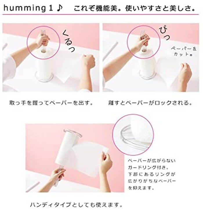 ◆取っ手を握る→ペーパーを出す→取っ手を離すと回転がロック→ペーパーを簡単にカット