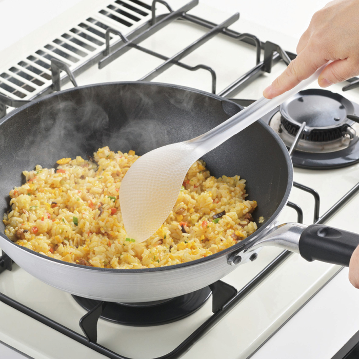 長いハンドル、極薄のフチ、フライパンにフィットする形状など、