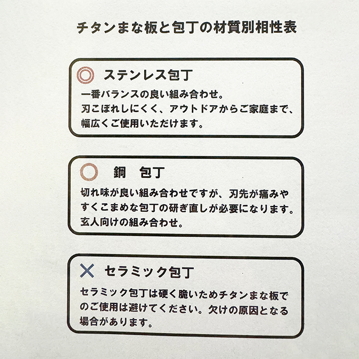 セラミック包丁は硬く脆いためチタンまな板でのご使用は避けてください。 欠けの原因となる場合があります。