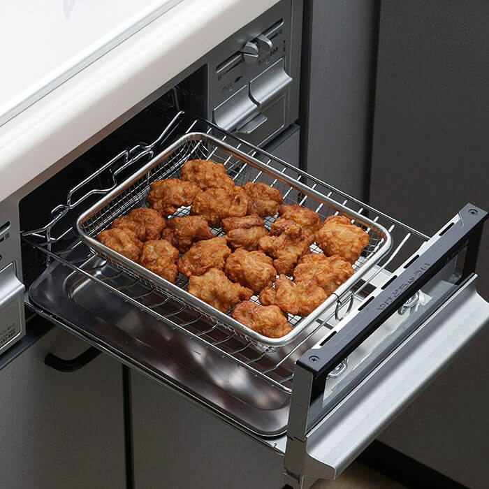バスケット型なので食材もこぼれにくく、アミで余分な油も下に落とせます。