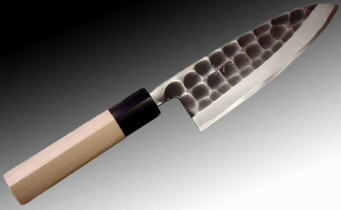 槌目模様の利点は、へこみ部分に空気が入ることで、素材との摩擦を少なくなりますので、刃離れの良さが実現します。また、錆び付いても磨き包丁より目立たない利点があります。