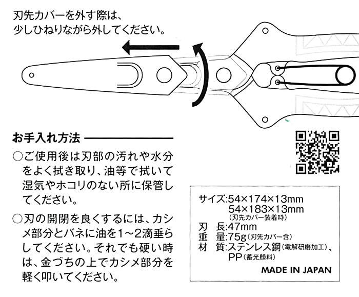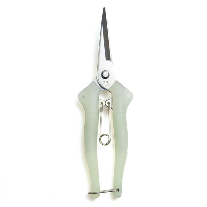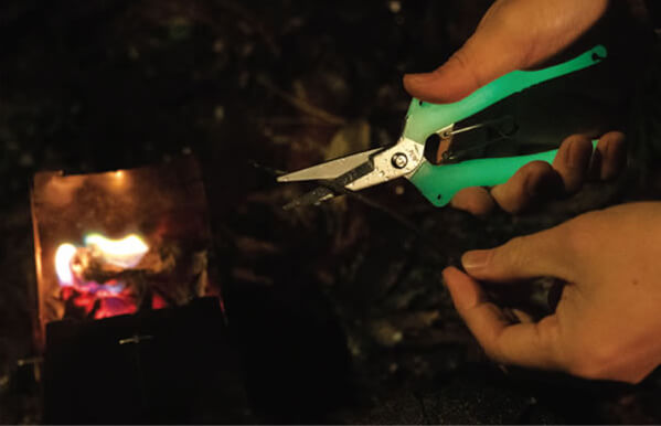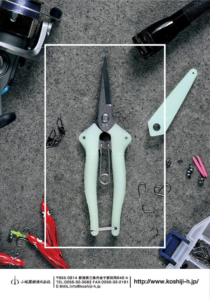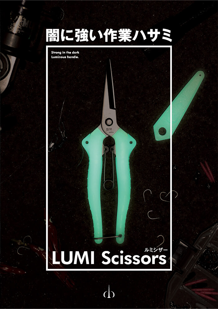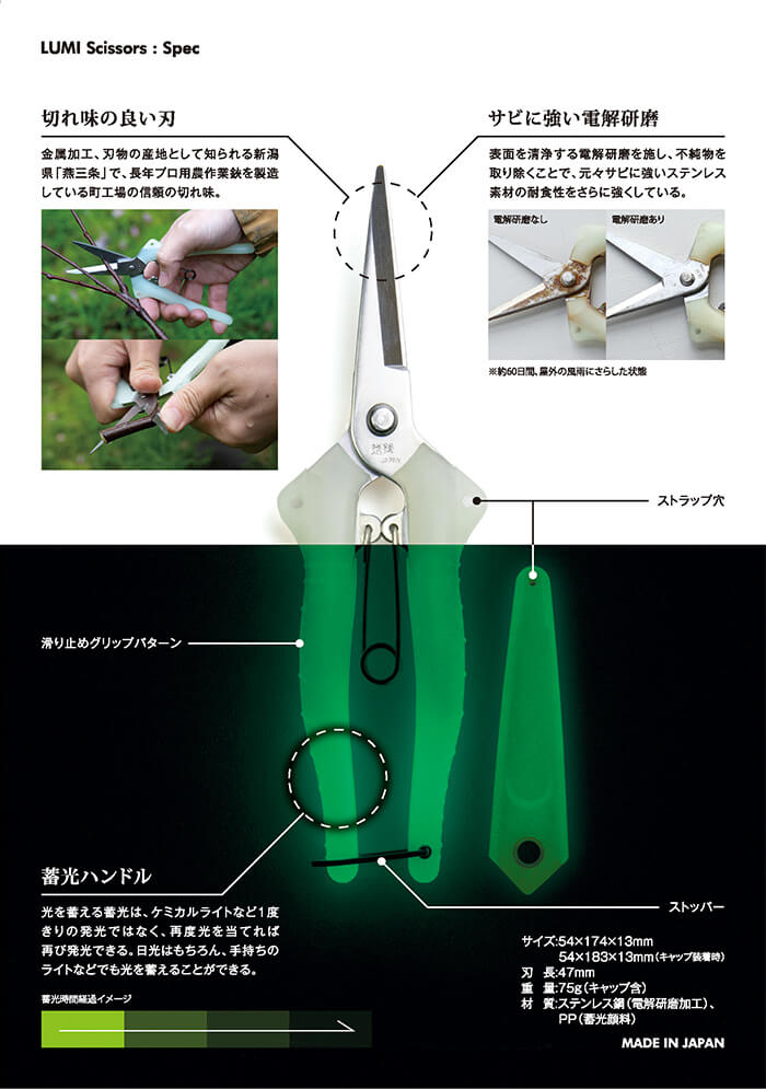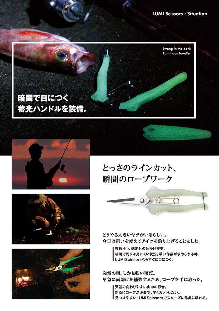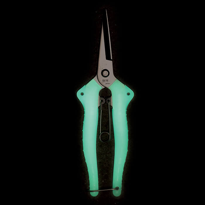 闇に強い作業ハサミ。暗闇で目に付く蓄光ハンドルを装備。