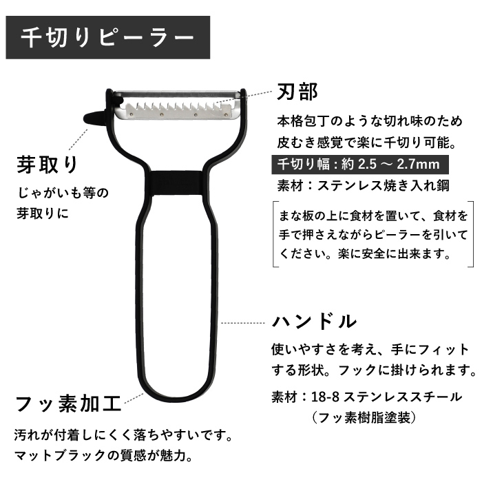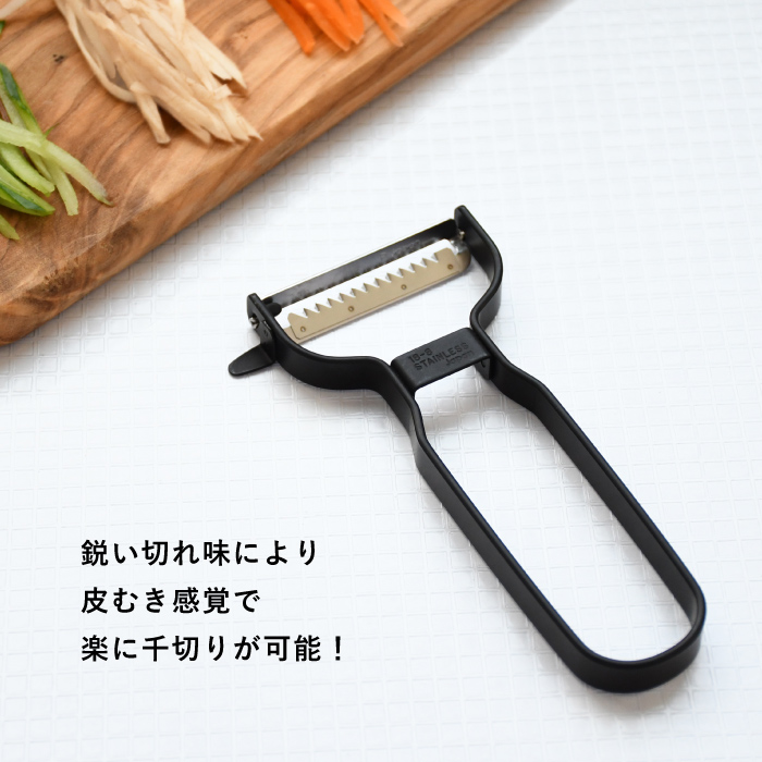本格包丁のような切れ味の刃のため、皮むき感覚で楽に千切りが可能。