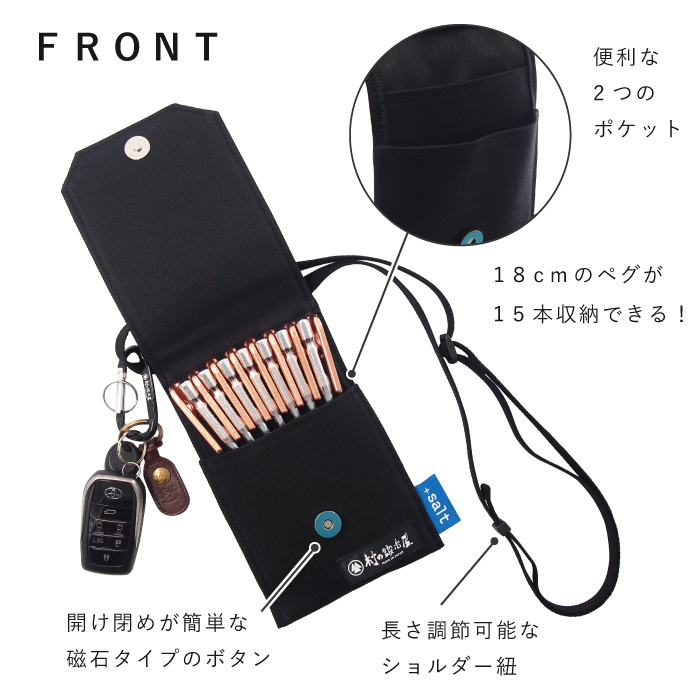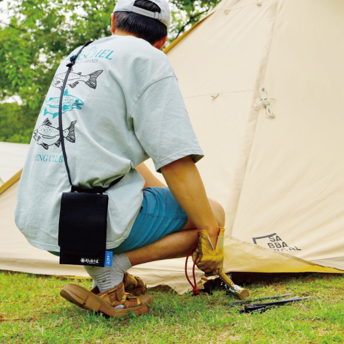 キャンプシーンでは18cmのペグを2つのポケット部分に最大15本きれいに収納することができます。