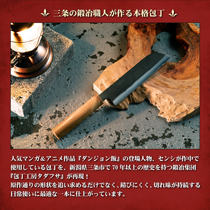 『ダンジョン飯』の登場人物、センシが作中で使用している包丁を、新潟県三条市で70年以上の歴史を持つ鍛冶屋『庖丁工房タダフサ』が再現!