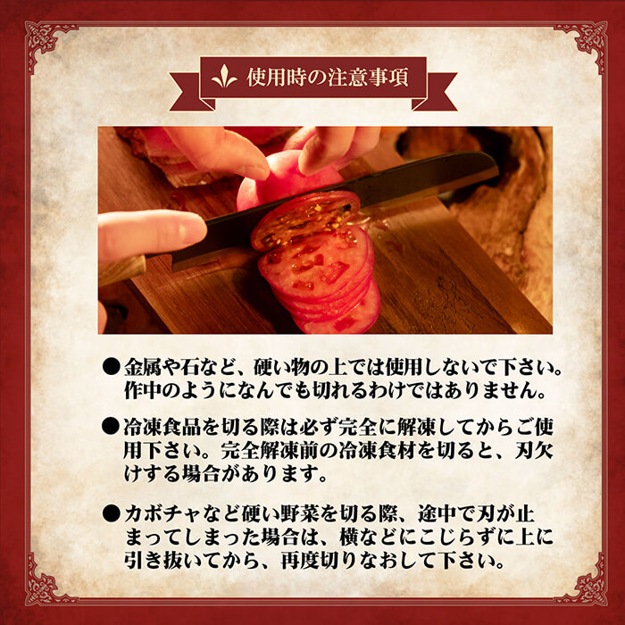・冷凍食品を切る際は必ず完全に解凍してからご使用下さい。完全解凍前の冷凍食材を切ると、刃欠けする場合があります。
