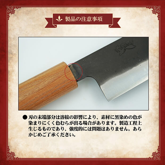 ・刃の末端部分は溶接の影響により、素材に黒染めの色が染まりにくく色むらが出る場合があります。製造工程上生じるものであり、強度的には問題はありません。あらかじめご了承ください。
