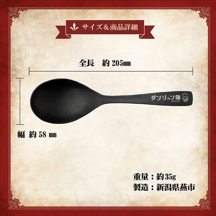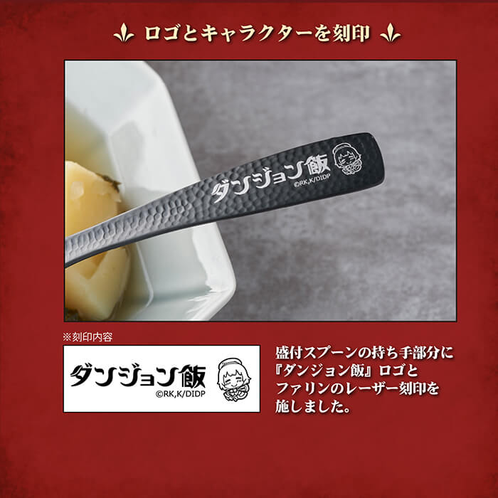 盛付スプーンの持ち手部分に『ダンジョン飯』ロゴと、ファリンのレーザー刻印を施しました。
