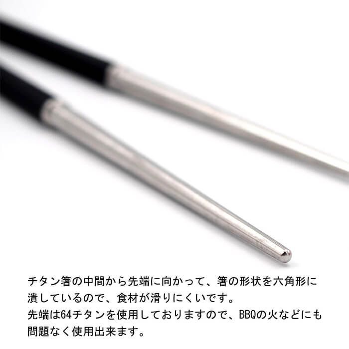 ・箸先端部は64チタンを使用しているので、アウトドアにおけるBBQなど 火を使う場所も選びません。