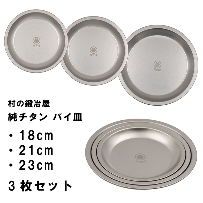 村の鍛冶屋 純チタン パイ皿 3枚セット18cm、21cm、23cm (No.3+No.2+No.1) ステンレスの頑丈さとアルミニウムの軽量性を兼ね揃えたチタン製だからアウトドアに最適! ネコポス配送 【頑張って送料無料!】