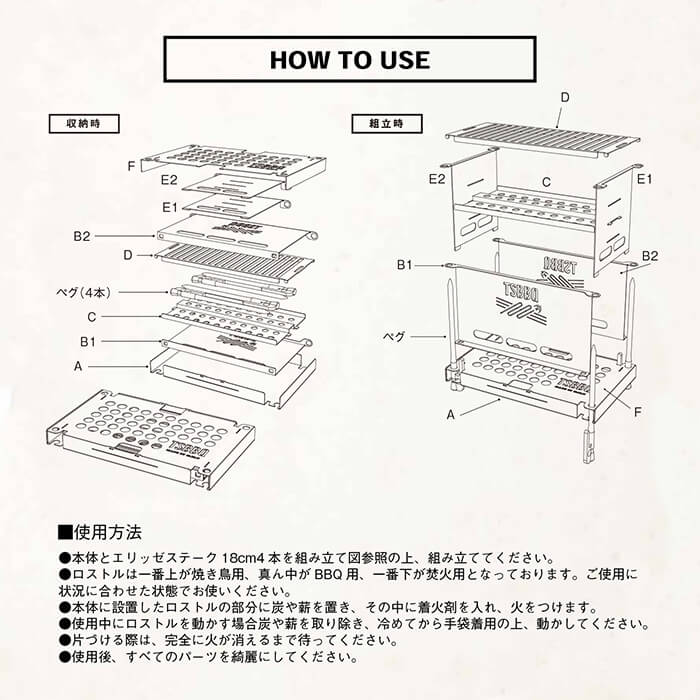 コンパクトで組立てもわかりやすくて簡単!天気が悪くてキャンプでは使ってませんが、とりあえず、ベランダでソロでBBQをしてみましたが、ロストルが3段階になっているので、用途に合わせて変えられるのが良いです! 今度は焚き火してみたいと思います!