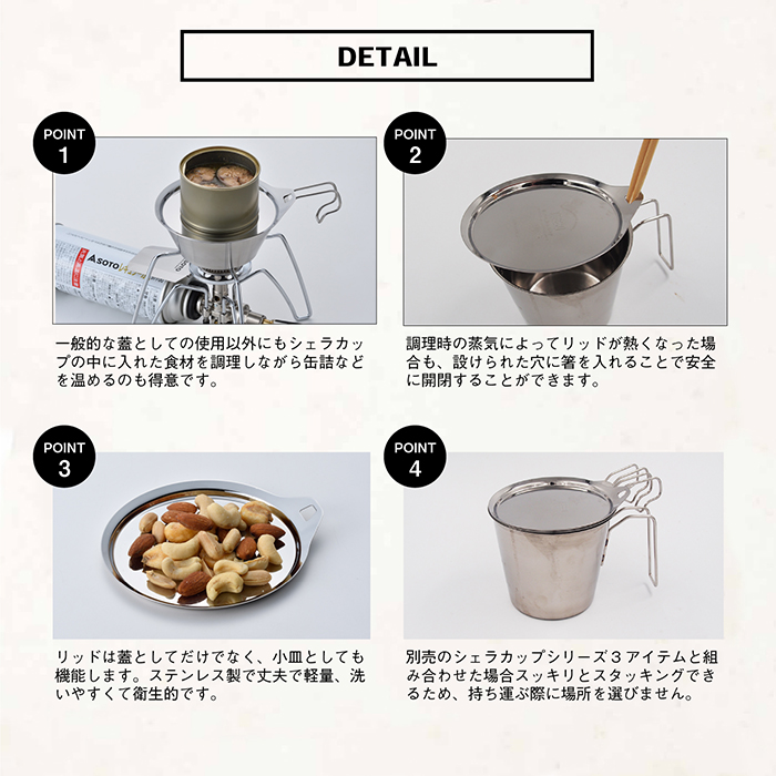 リッドは蓋としてだけでなく、小皿としても機能します。ステンレス製で丈夫で軽量、洗いやすくて衛生的です。