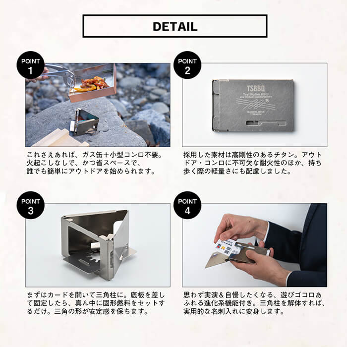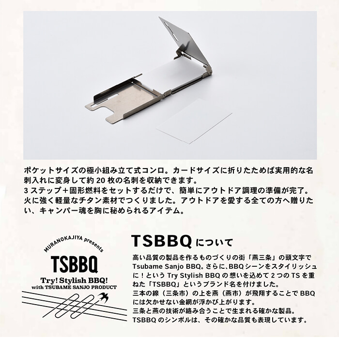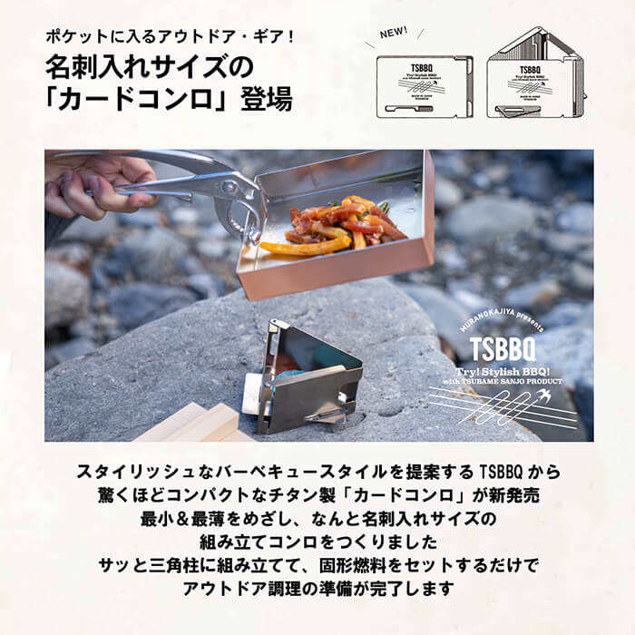 スタイリッシュなバーベキュースタイルを提案するTSBBQから、驚くほどコンパクトなチタン製「カードコンロ」が新発売。