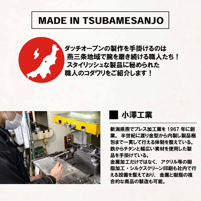新潟県燕でプレス加工業を1967年に創業。半世紀に渡り金型から内製し製品梱包まで一貫して行える体制を整えている。鉄からチタンと幅広い素材を使用した製品を手掛けている。