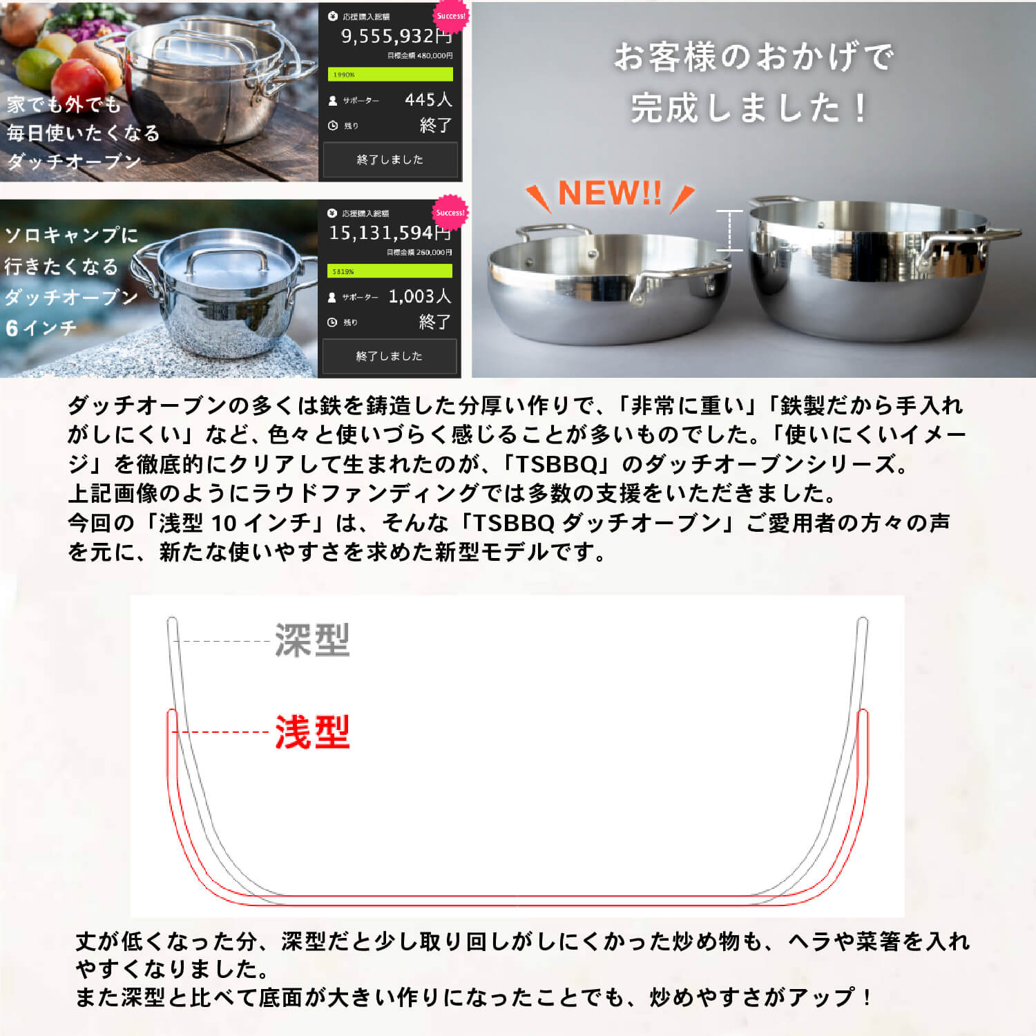 今回の「浅型10インチ」は、そんな「TSBBQダッチオーブン」ご愛用者の方々の声を元に、新たな使いやすさを求めた新型モデルです。
