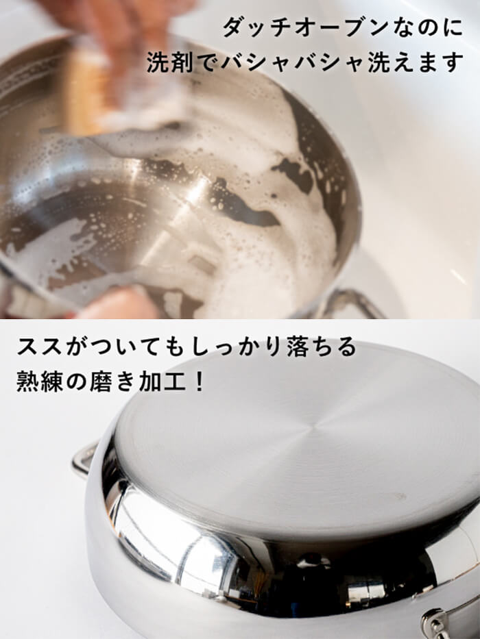 ステンレスダッチオーブンの利点である使い始めや使用後のシーズニング(油慣らし)不要、高耐久に加え、汚れが落ちやすく、サビにくい。また洗剤でもしっかりと洗うことができます。