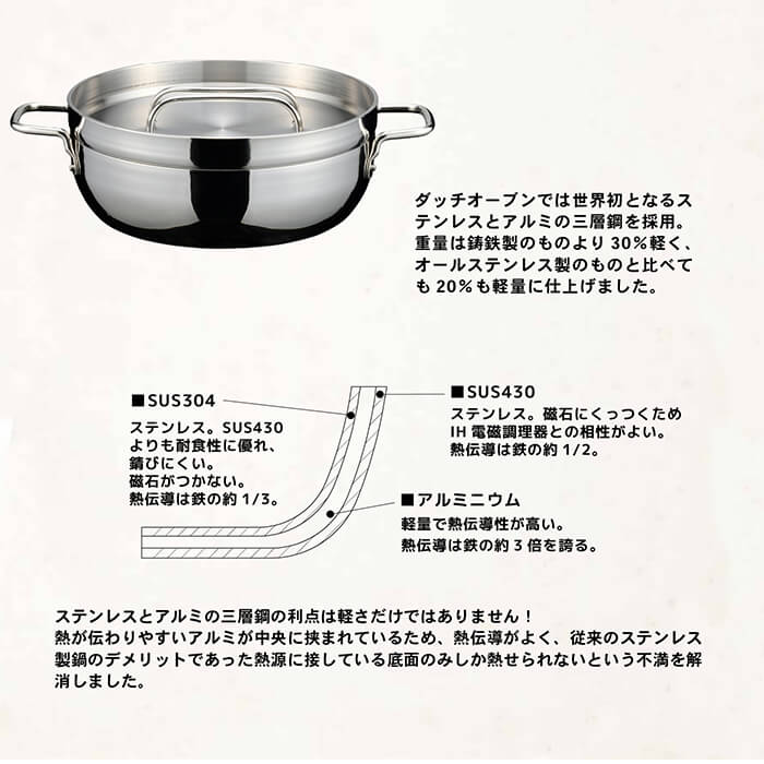 ダッチオーブンでは世界初となるステンレスとアルミの三層鋼を採用。