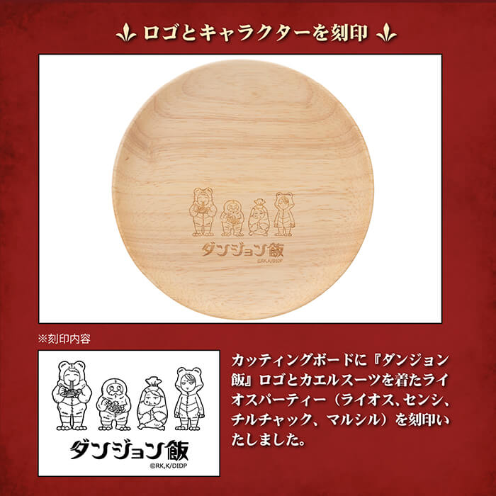 カッティングボードに『ダンジョン飯』ロゴとカエルスーツを着たライオスパーティー(ライオス、センシ、チルチャック、マルシル)を刻印いたしました。