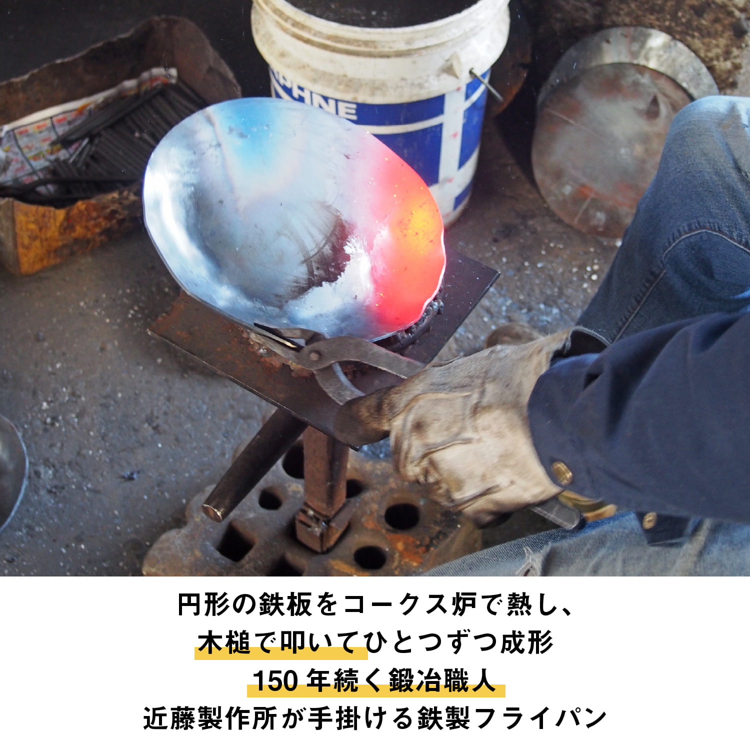 円形の鉄板をコークス炉で熱し、木槌で叩いてひとつずつ成形しています。