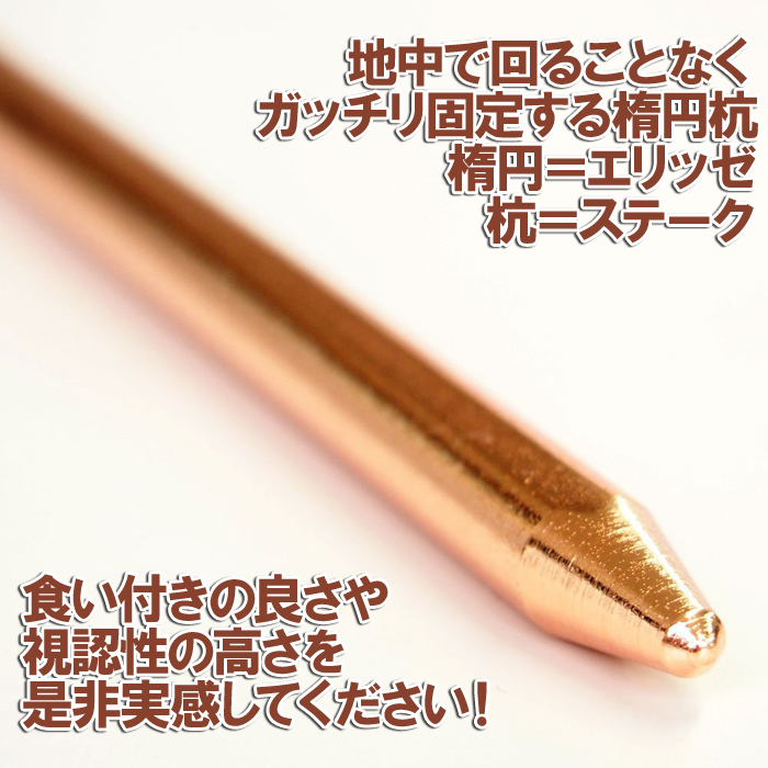 芝生や砂利などに置いたペグが目立たなくて苦労する! そんな声から、あえて色を付けました。 耐食性にも効果がある銅メッキを施してあります。またクリア塗装することで透明感のある光沢が完成しました。メインポールに最適な全長380mmです。