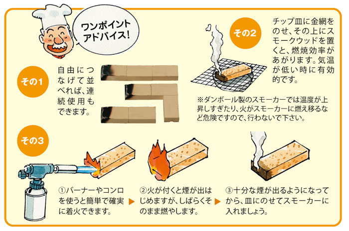 3個の断面を連結させて置けば連続約5時間の燻煙が可能です。