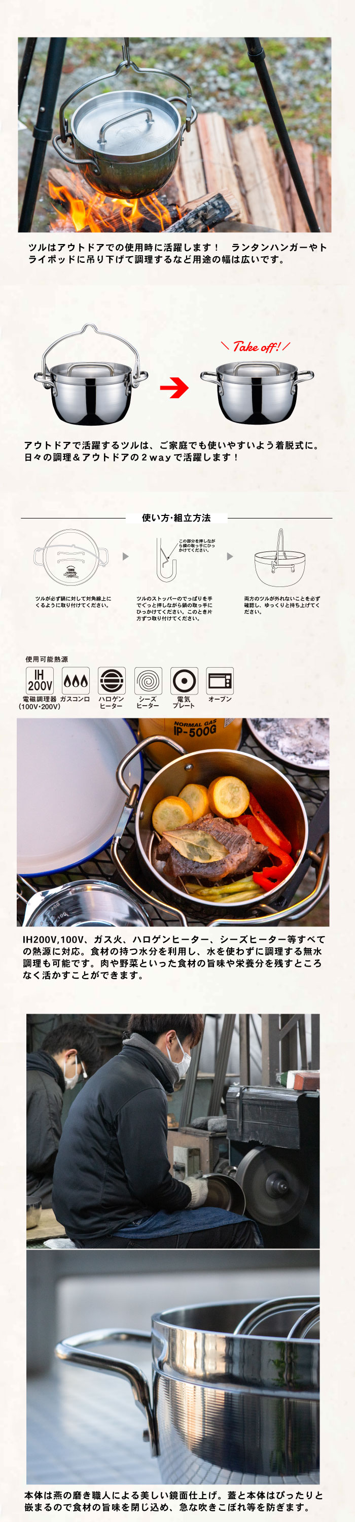 アウトドアで活躍するツルは、ご家庭でも使いやすいよう着脱式に。日々の調理&アウトドアの2wayで活躍します!