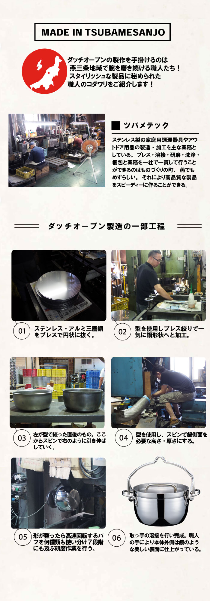 ステンレス製の家庭用調理器具やアウトドア用品の製造・加工を主な業務としている。プレス・溶接・研磨・洗浄・梱包と業務を一社で一貫して行うことができるのはものづくりの町、燕でもめずらしい。それにより高品質な製品をスピーディーに作ることができる。